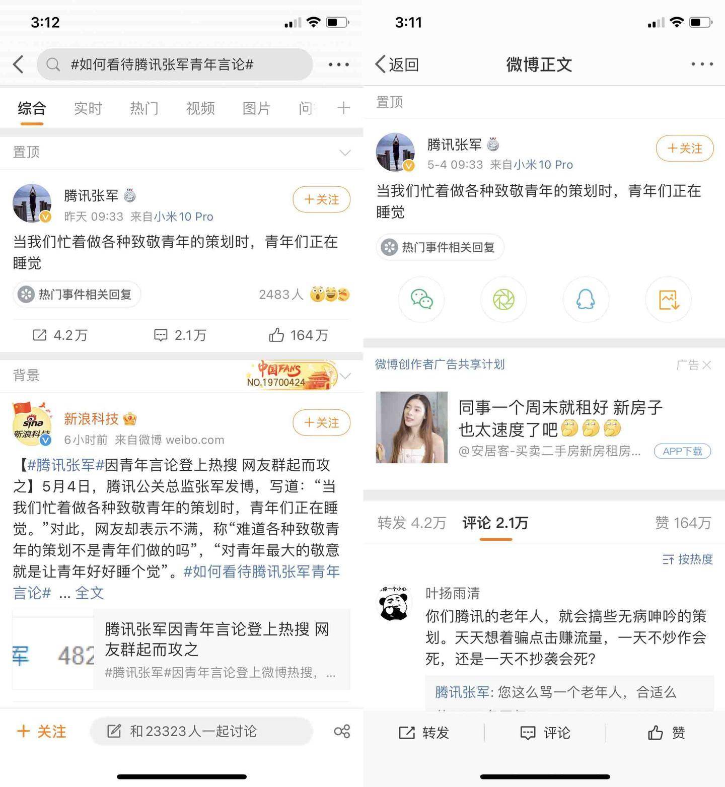 腾讯公关总监张军在2021年5月4日青年节发微博说道,“当我们忙着做各种致敬青年的策划时,青年们正在睡觉”。网友却表示不满;当也有人这是其个人微博发个牢骚而已,无所谓;也有网友表示“对青年最大的敬意就是让青年好好睡个觉”。如何看待腾讯张军的青年言论?
